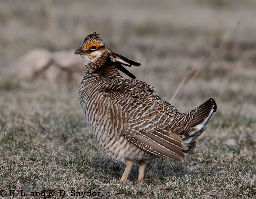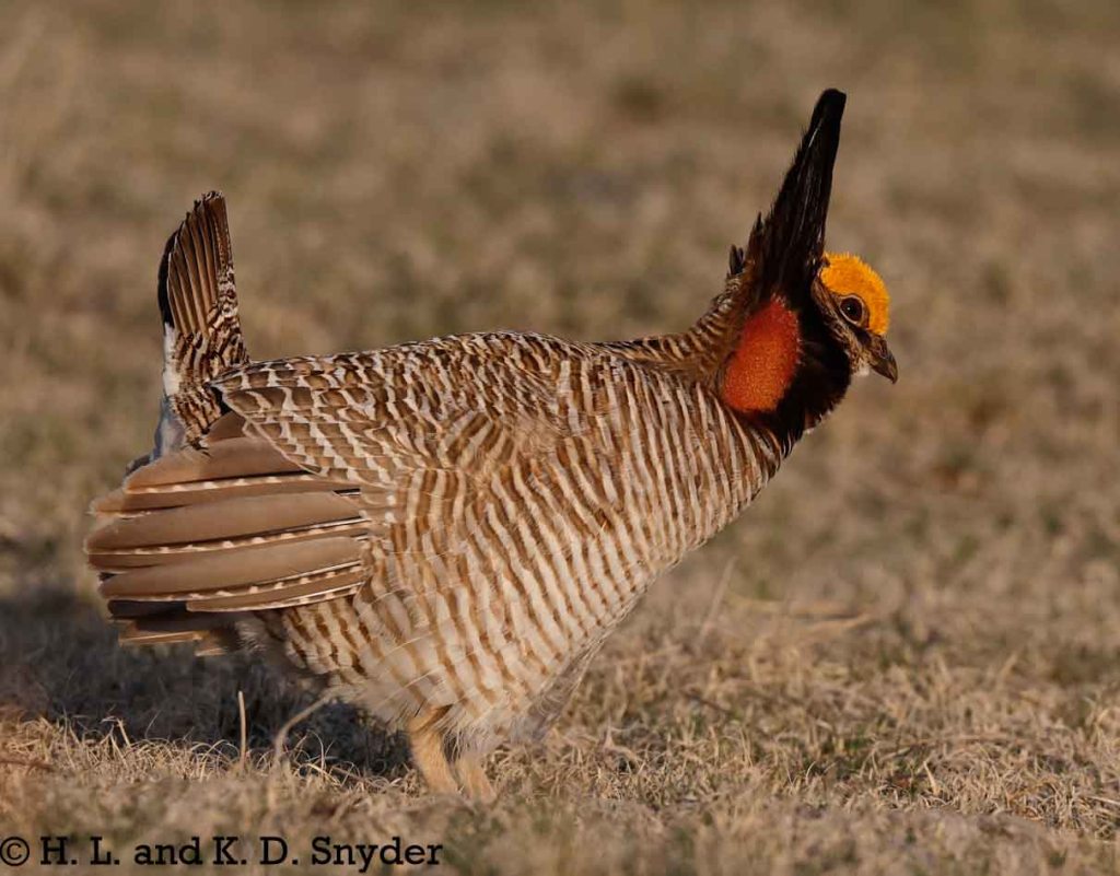 First image shows a male Lesser Prairie-Chicken facing off with a male Greater Prairie-Chicken. (GPCH is larger, has darker barring, a larger, lighter sac, and a deeper booming call.)