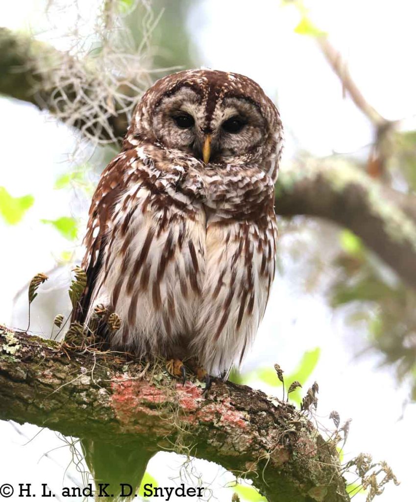 4/5/2022 Fort Clinch, Amelia Island, FL: Always fun to see a Barred Owl out in the woods. Also, Northern Parula , Mourning Dove , and Red-bellied Woodpecker .