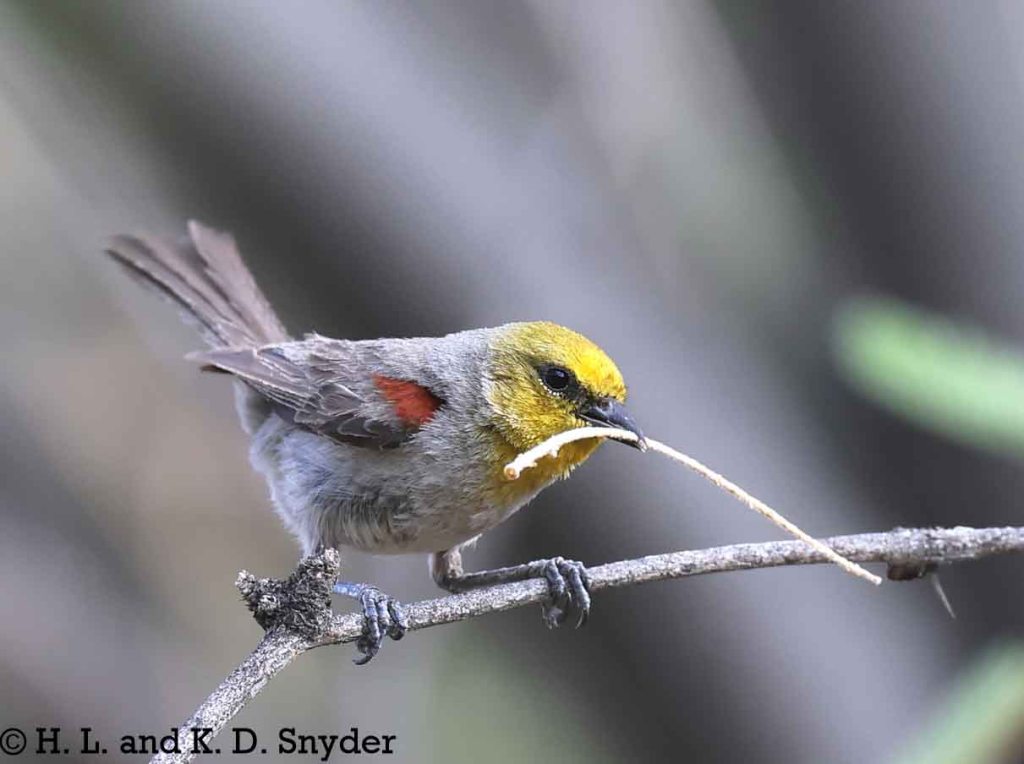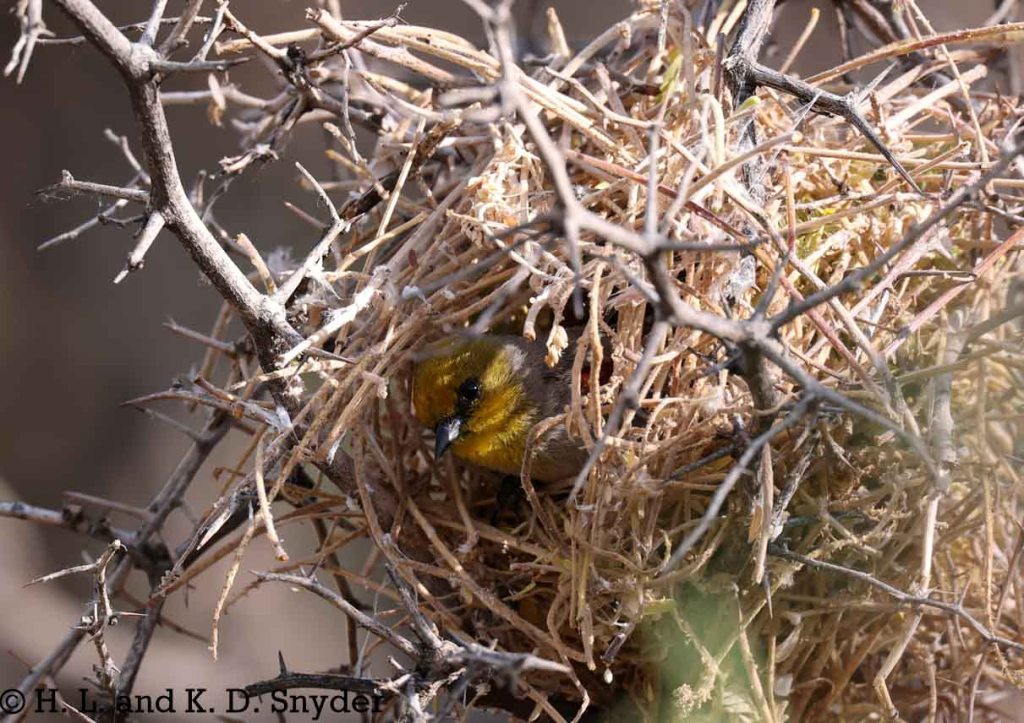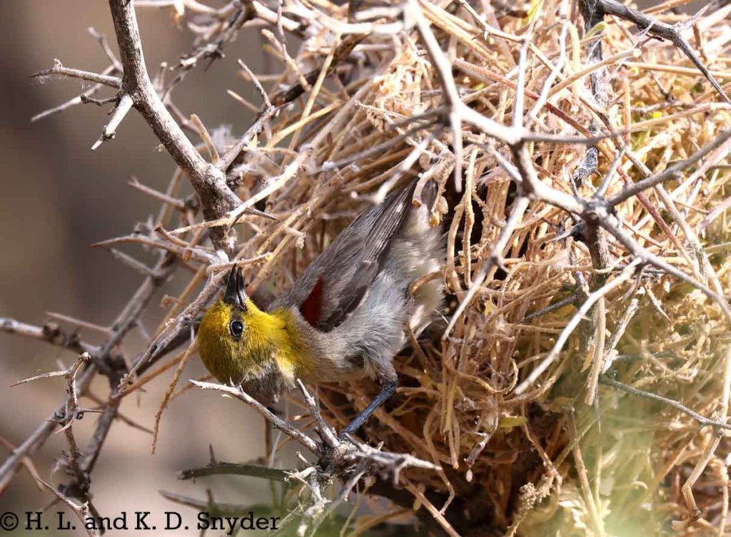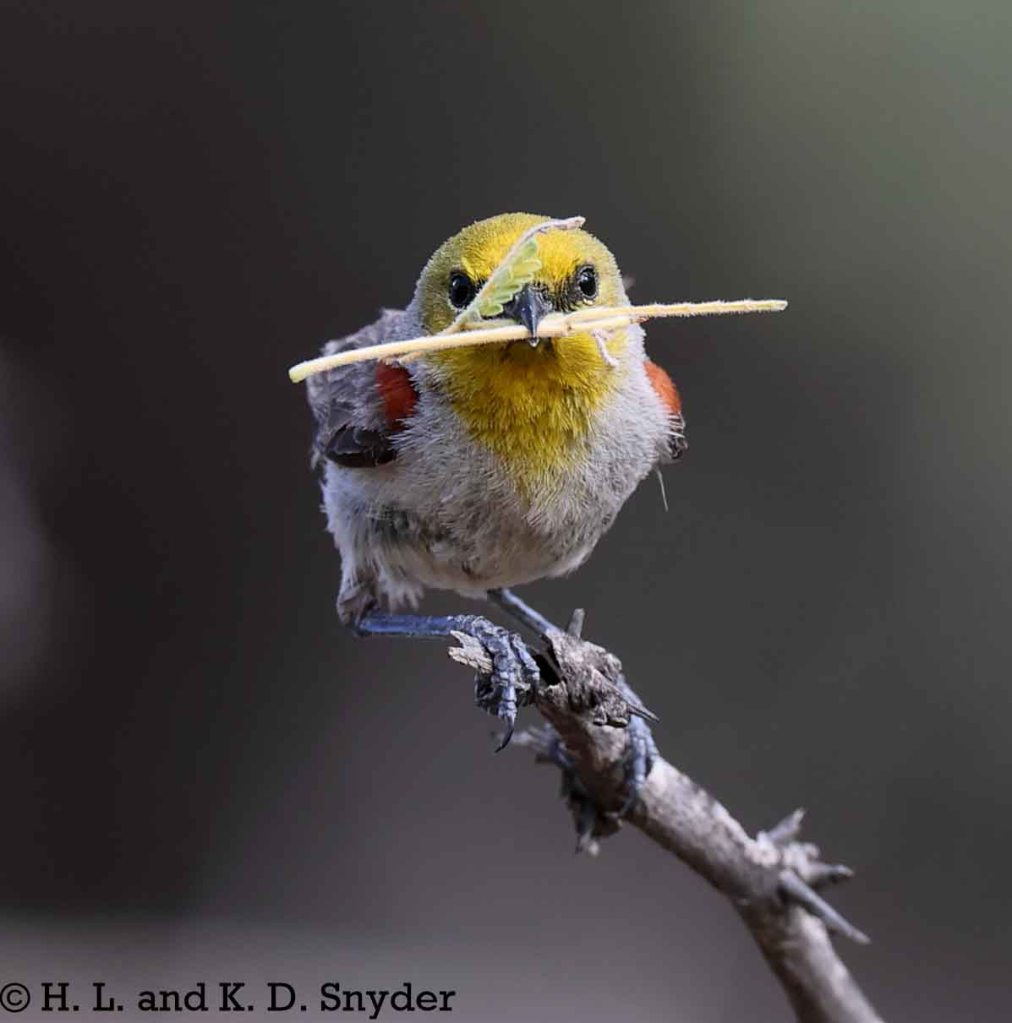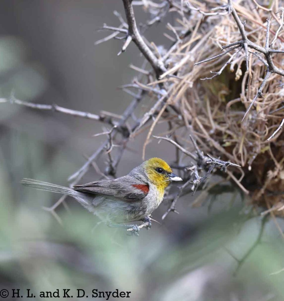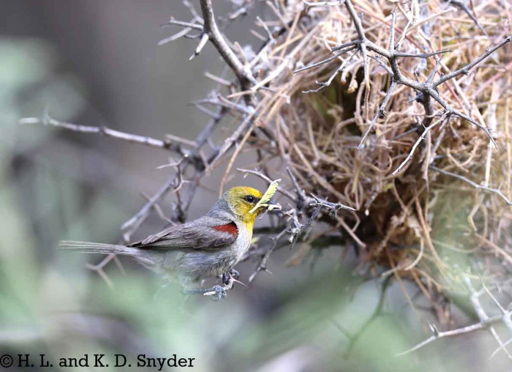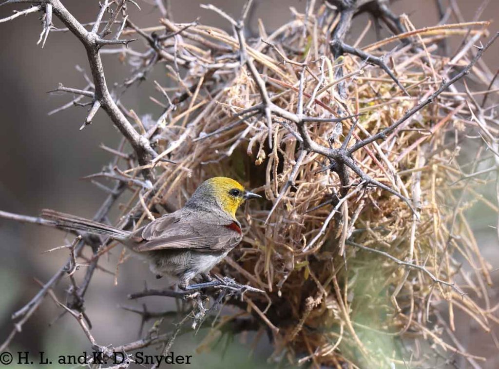 7/4/2025 Box Canyon Rd. nr Madera Can., AZ: Verdin at nest. We watched him nest-build until it was time for the Buff-collared Nightjar to start calling. We heard it call exactly at 8:10 pm as we listened with a number of other hopeful birders.