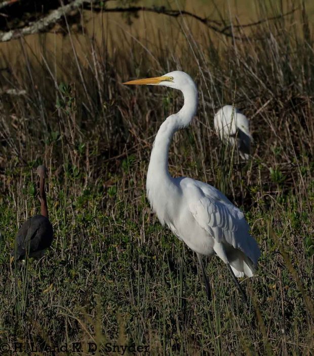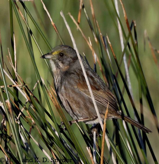 10/18/25 Amelia Island, FL: On a bike ride with the camera we caught a few goodies: the often illusive Seaside Sparrow , Black-and-white Warbler , Yellow-throated Vireo , Yellow-bellied Sapsucker , Little Blue Heron , Pileated Woodpecker , Tufted Titmouse , Great Egret , and Red-bellied Woodpecker snatching acorns .