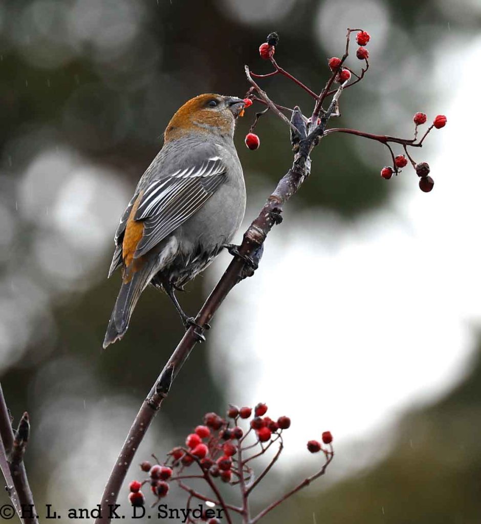 11/29 to 12/2/24 We took the Matane Ferry to Godbout, then worked our way down to Quebec City via Saguenay, Canada: Pine Grosbeak in berries, Evening Grosbeak in seeds, Black-capped Chickadee in pine cones, and a Hairy Woodpecker digging in a tree.