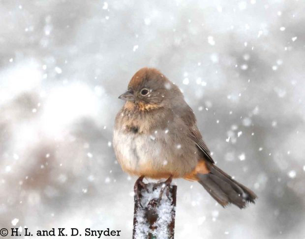 1/5 and 1/6/24 (It snowed in the hills where we were!) near Phoenix, AZ: We caught Sagebrush Sparrow , Abert’s Towhee , Verdin (m), Gambel’s Quail m,f), Black-tailed Gnatcatcher , Gilded Flicker , Black-throated Sparrow , Brewer’s Sparrow , Cactus Wren , and Canyon Towhee . Also: a Phainopepla (m) that appeared to be confused as to which snowflake he should be flycatching, a Green-tailed Towhee , and White-crowned Sparrow (ad, juv.) along with some pics of desert plants sprouting snow. Also: A Rufous-crowned Sparrow hidden in the snow.