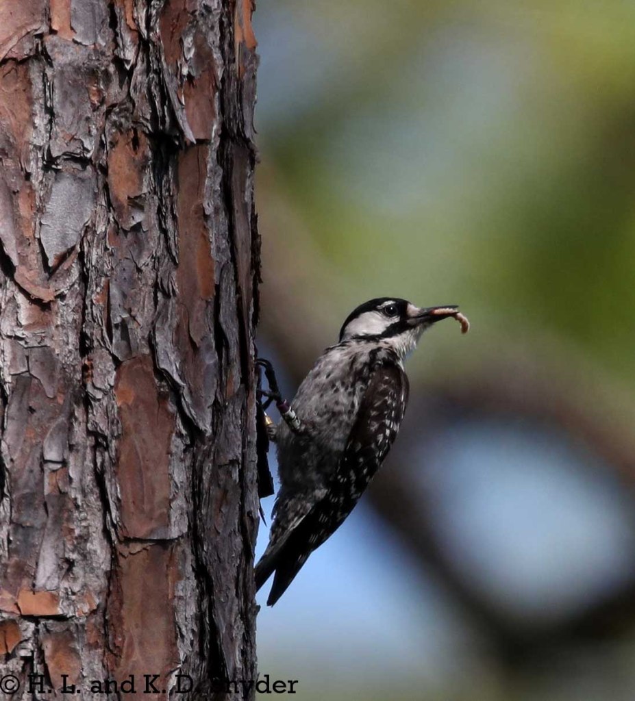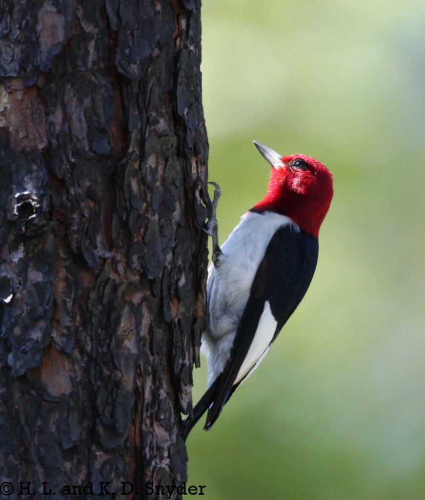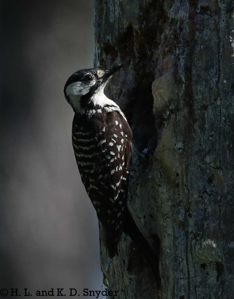 Okefenokee NWR, GA: We went searching for any Red-cockaded Woodpecker nests and found one where at least two little ones (m,f) were already peeking out of the nest hole. It is always interesting to see the sap dripping from around these nests. Both heavily banded parents were feeding them spiders and worms. Also: Red-headed Woodpecker .