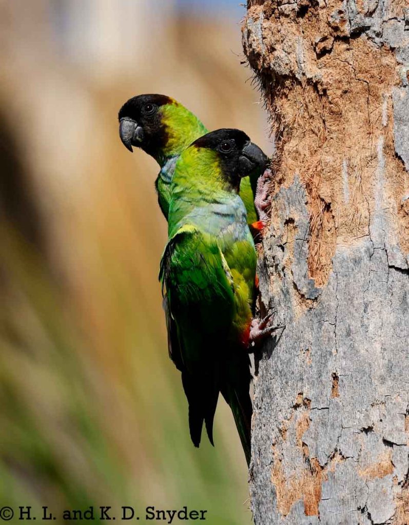 6/16/24 Fort de Soto Park, FL: Nanday Parakeet individuals were checking out holes in a dead palm at the park.