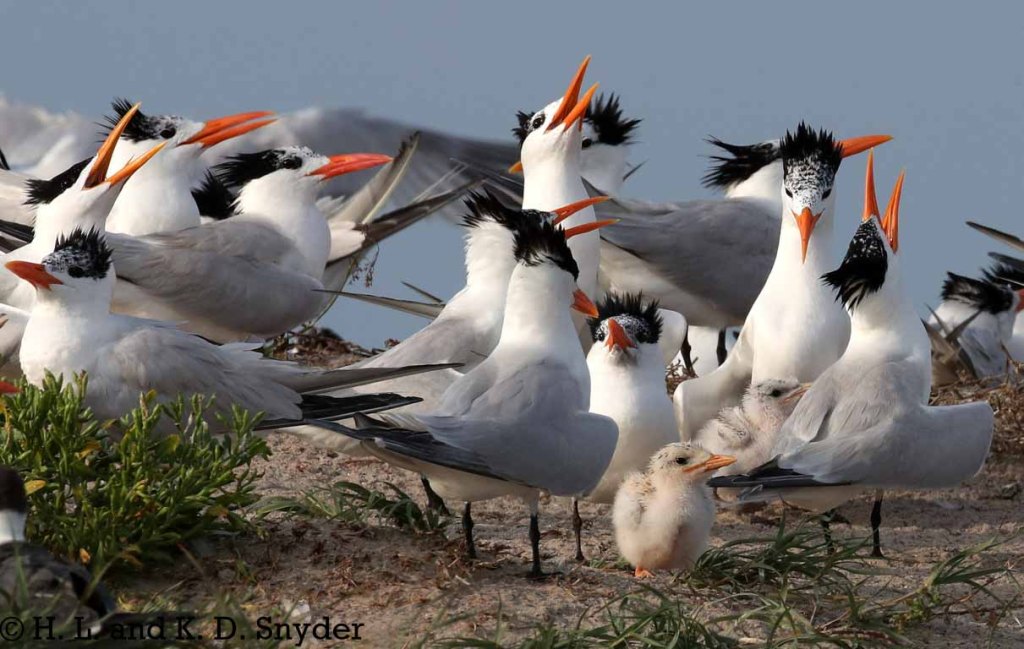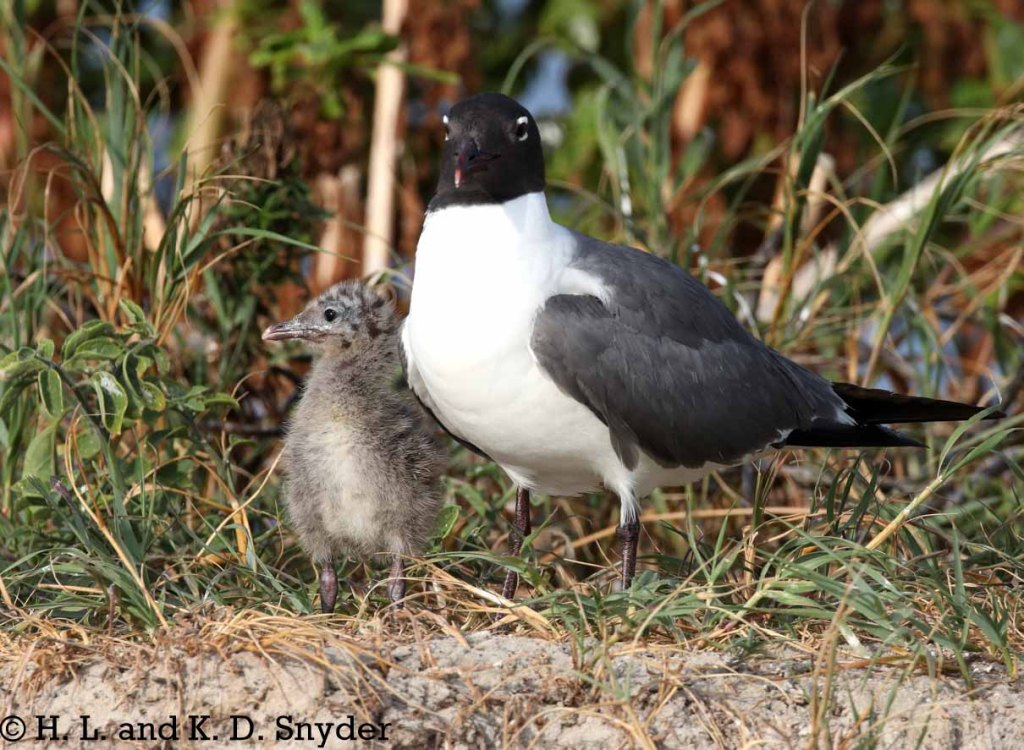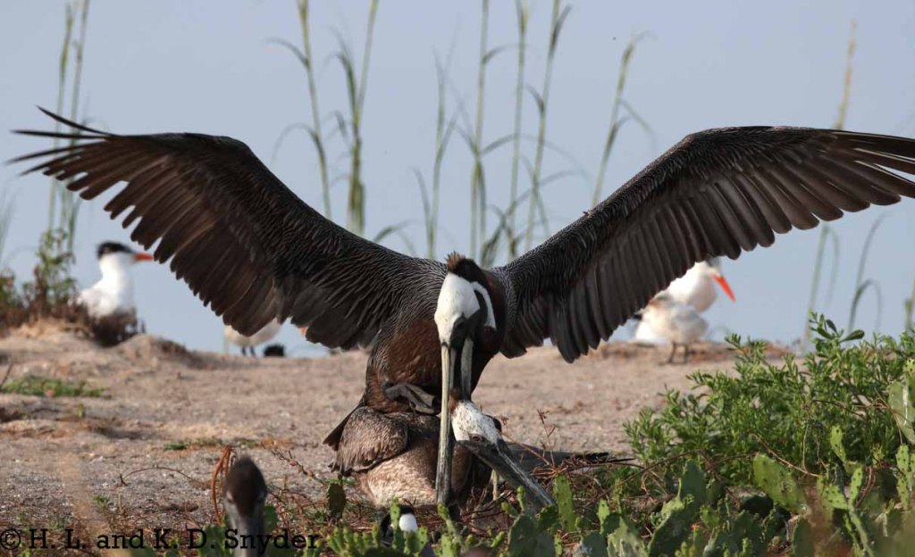 More images of Laughing Gull chicks and adults along with the first Brown Pelican chicks we have seen and a pair mating. Also: Herring Gull , Royal Tern with their young still on the dunes , Mottled Duck , Boat-tailed Grackle , and Wilson’s Plover .