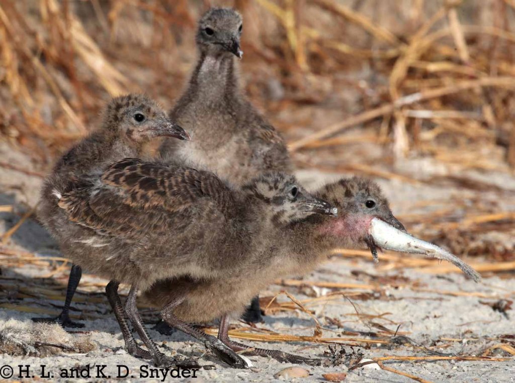 Then, there were four Laughing Gull chicks trying to share one fish. The littlest one held on and finally succeeded in swallowing the huge meal in spite of its siblings.