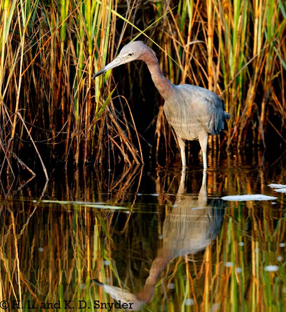 9/14/23 Amelia Island, FL: A brief stop at a sunlit pond rewarded us with a Little Blue Heron with a nice reflection, a Northern Mockingbird family, and a Tricolored Heron hunting with a fun reflection as well. A Wood Stork watched it all from the pines. A beautiful morning!
